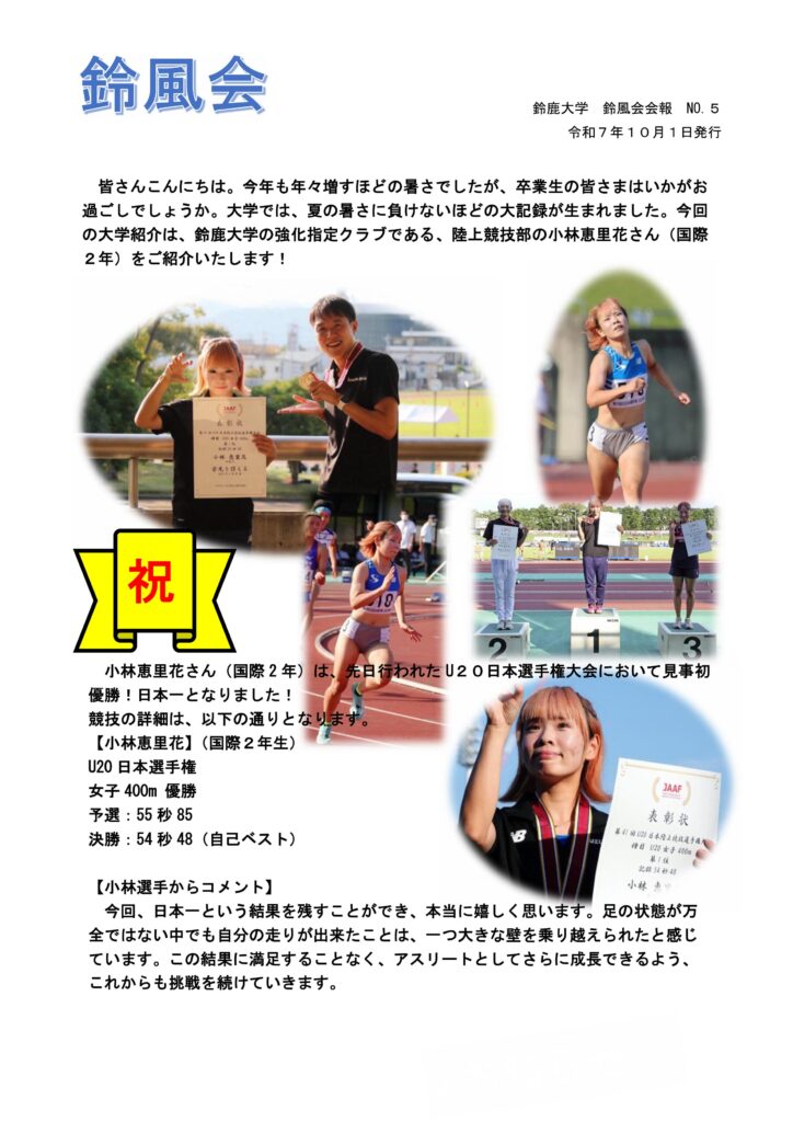 鈴鹿大学陸上競技部の小林恵里花さん(国際2年)が、先日行われたU20日本選手権大会において見事日本一となりました。